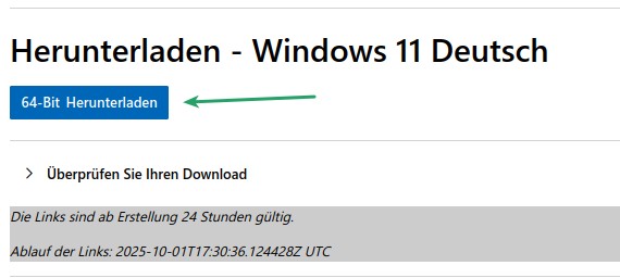 - Geht auf die Win11-Downloadseite. Scrollt wie gesagt am "Upgrade-Assistent" vorbei nach unten: "Windows 11 Laufwerkimage (ISO) für x64-Geräte herunterladen". "Jetzt herunterladen" drücken, Sprache = Deutsch wählen und bestätigen. Achtung: Download ist ca. 5 GB groß und kann lange dauern. Legt die Datei mit dem Namen "Win11_24H2_German_x64.iso" an einem Ort ab, an dem Ihr sie wiederfindet.