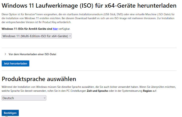 - Geht auf die Win11-Downloadseite. Scrollt wie gesagt am "Upgrade-Assistent" vorbei nach unten: "Windows 11 Laufwerkimage (ISO) für x64-Geräte herunterladen". "Jetzt herunterladen" drücken, Sprache = Deutsch wählen und bestätigen. Achtung: Download ist ca. 5 GB groß und kann lange dauern. Legt die Datei mit dem Namen "Win11_24H2_German_x64.iso" an einem Ort ab, an dem Ihr sie wiederfindet.
