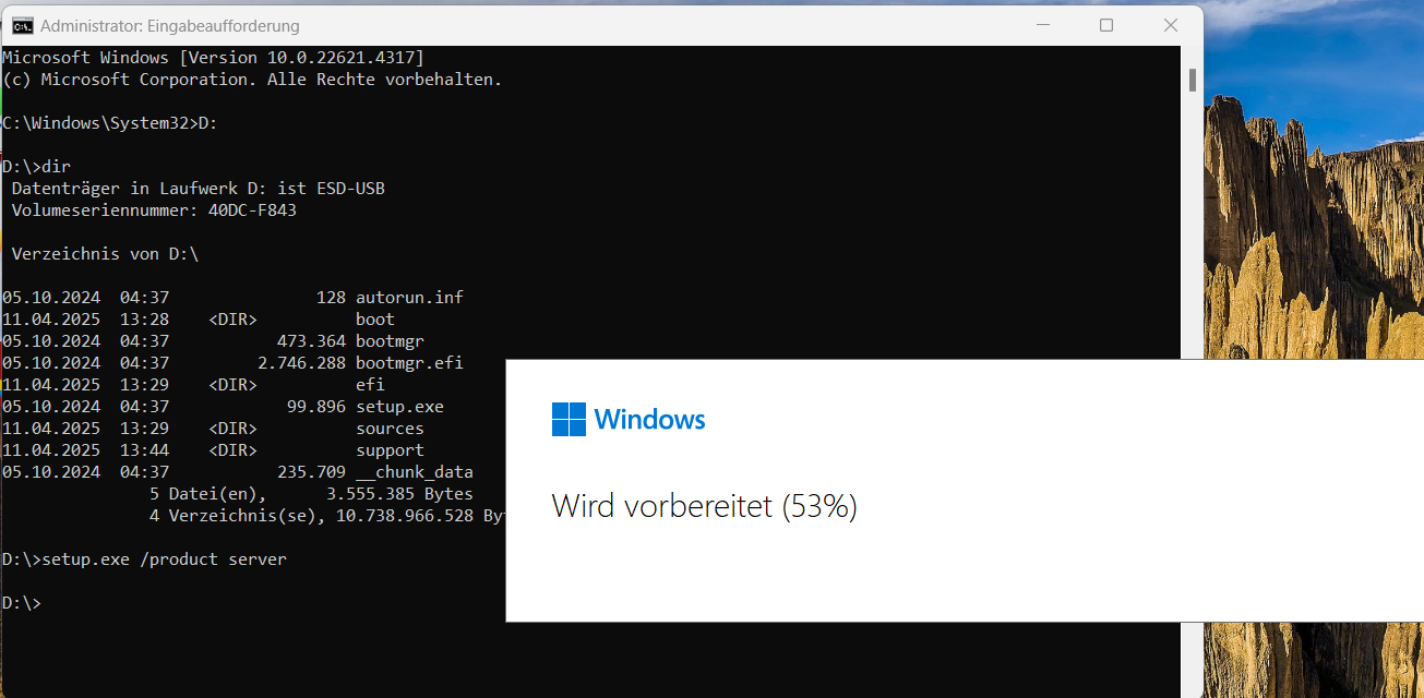 Die hier beschriebene Methode, im Gegensatz zur offiziellen mit dem "Windows Upgrade-Assitent" und der "PC-Integritätsprüfung" (die prüft, ob die Hardware die von Microsoft vorgegebenen Anforderungen erfüllt), funktioniert AUCH bei Hardware, die die Anforderungen nicht erfüllt, und das sowohl bei PCs, auf denen noch eine beliebige Version von Win10 läuft, oder aber eine ältere Jahres-Version von Win11, die bereits "illegal" installiert wurde, z.B. Win11 22H2, die jetzt aus dem Support fällt. Noch ein Hinweis: Die Installation meldet sich als "Windows Server", das tut aber nichts zur Sache, die vorher installierte Edition bleibt bestehen.